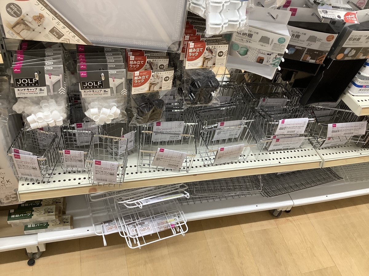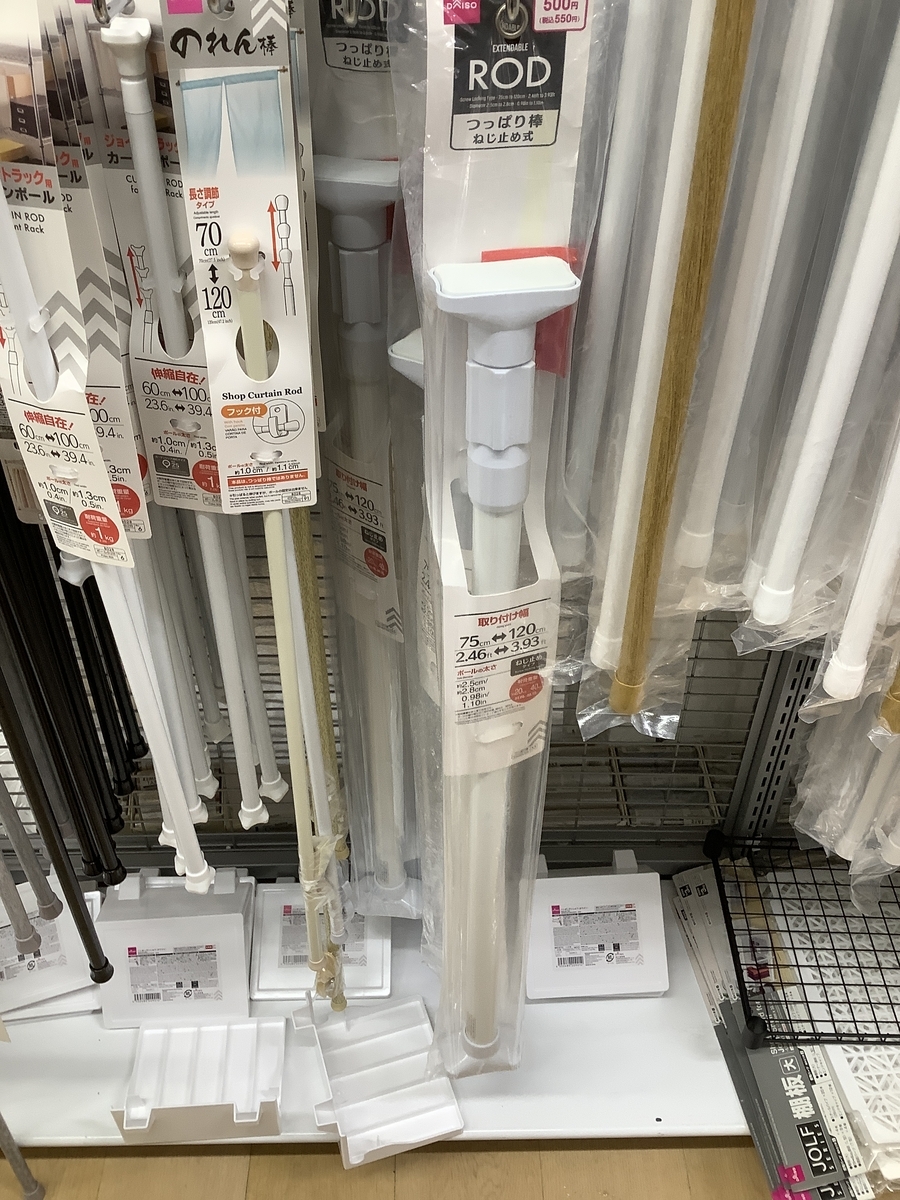 ニトリ梅田、ダイソー梅田では、 突っ張り棒やその関連の収納用品は品薄でした。 地下鉄今里駅から北へ10何分歩く商店街のダイソー今里店をチェ ックしてみたら、突っ張り棒関連は品揃えがよかったです。